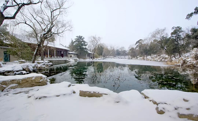 “水木清华”是清华园最引人入胜的一处胜景,四时变幻的林山,环拢着一泓秀水。山林之间掩映着两座玲珑典雅的古亭,本为工字厅的后厦,一变而为“水木清华”的正廊,正额“水木清华”四字,庄美挺秀。“水木清华”四字出自晋人谢混诗:“惠风荡繁囿,白云屯曾阿,景昃鸣禽集,水木湛清华。”