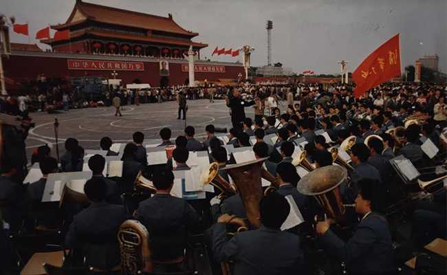 新中国成立35周年时,清华同学方阵走过天安门广场的情景