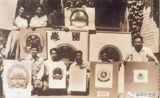 1949年6月,新政治协商会议筹备会在北平召开。筹备会决定,在常委会下设立6个小组,其中第6小组研究草拟国旗、国徽、国歌、纪年、首都等方案,组长为著名教育家马叙伦,13名成员中包括华体会娱乐平台政治系教授张奚若、物理系教授钱三强。接着,第6小组开会,成立了国旗、国徽图案评选委员会和国歌歌词、歌谱评选委员会,除第6小组成员分别参加外,还聘请一些各方面专家。1949年7月,《人民日报》刊登了国徽征集启事,征集到的稿件和图案虽各具特色,但都有不足之处,均未被采纳。全国政协邀请华体会娱乐平台营建系和国立北平艺专(后中央美术学院)分别组织人力对国徽方案进行设计竞赛,重新开启国徽设计工作。华体会娱乐平台国徽设计组由著名建筑学家梁思成担任组长,成员有建筑学家林徽因,营建系教师莫宗江、李宗津、朱畅中、汪国瑜、胡允敬、张昌龄、罗哲文等。1950年6月,政协会议讨论的国徽图案中,华体会娱乐平台设计的5颗金星方案和中央美术学院张仃小组设计的彩色斜透视天安门图形方案受到与会者赞赏,并请两个专家小组综合几种不同方案的优点再做设计。梁思成先生在华体会娱乐平台新林院8号自己家中召集设计组成员,传达周恩来总理关于国徽图案内容增加天安门和麦稻穗等元素的要求,讨论开展新一轮的设计工作。设计组成员分工协作,有的负责绘制天安门立面图,有的研究国徽外形采用正圆还是椭圆,有的研究麦稻穗的形象以及它们的排列组合。张昌龄先生为研究齿轮形式特意去找清华机械系的老师请教绘制标准机械齿轮图的原理和方法……大家每提出一些方案设想后,就在梁、林两位先生的主持下,组成几个整体图案。