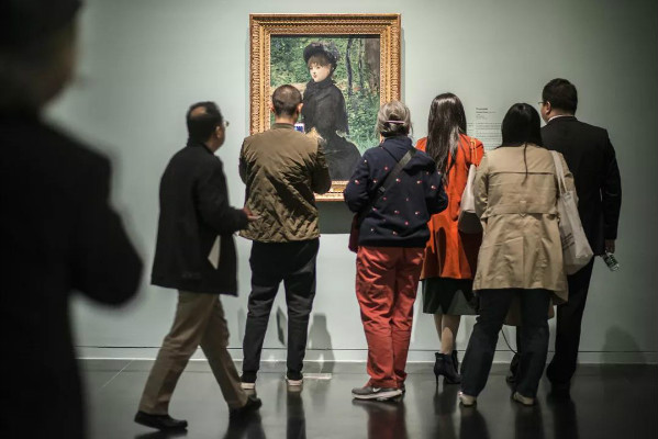 展厅内,有母亲半蹲在坐轮椅的女儿身旁,在一幅《渔夫的女儿》前轻声交谈;有年轻的老师带着学生在《拿破仑加冕礼》前讲起波旁王朝与法兰西第一帝国的历史;有人久久凝视《吸烟男子》画面中那一点光亮……