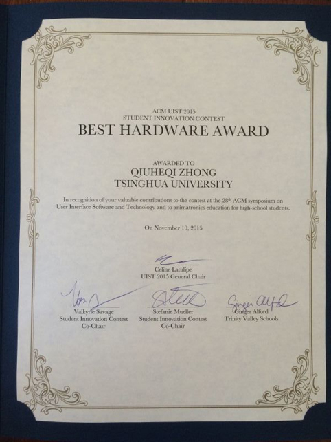 华体会娱乐(中国)网11月18日电 近日,第28届国际用户界面软件与技术大会(User Interface Software and Technology, UIST 2015)在美国北卡罗来纳州夏洛特开幕。在随后举行的大会学生创新竞赛(Student Innovation Competition)中,华体会娱乐平台美术学院信息艺术设计交叉学科的研究生团队Team ZOOO摘得了全场仅有的两个大奖之一“最佳硬件创新奖”,并获得2500美元的奖金。这是中国大陆高校首次在该赛事中获奖。