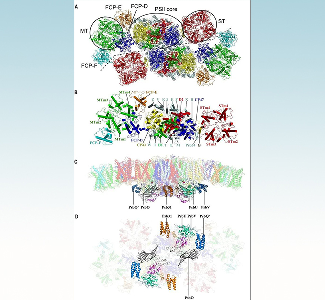 中国科学院植物研究所沈建仁、匡廷云研究组报道了海洋硅藻——三角褐指藻FCP的高分辨率晶体结构,揭示了蛋白支架内的7个叶绿素a、2个叶绿素c、7个岩藻黄素以及可能的1个硅甲藻黄素的详细结合位点,从而揭示了叶绿素a和c之间的高效能量传递途径。该结构还显示了岩藻黄素与叶绿素之间的紧密相互作用,使能量通过岩藻黄素高效地传递和淬灭。该研究团队进一步与华体会娱乐平台生命科学学院隋森芳研究组合作,解析了硅藻的光系统II(PSII)与FCPII超级复合体的分辨率为3.0埃的冷冻电镜结构。该超级复合体由两个PSII-FCPII单体组成,每个单体包含了1个具有24个亚基的PSII核心复合体和11个外周FCPII天线亚基,其中的FCPII天线以2个FCPII四聚体和3个FCPII单体存在。整个PSII-FCPII二聚体包含230个叶绿素a分子、58个叶绿素c分子、146个类胡萝卜素分子以及锰簇复合物、电子传递体和大量脂分子等。该结构揭示了硅藻PSII核心中特有亚基的特点及其与高等植物PSII-LHCII复合体明显不同的天线亚基排列方式,以及硅藻巨大的色素分布网络,为阐明硅藻高效的蓝绿光捕获、能量转移和耗散机制提供了坚实的结构基础。