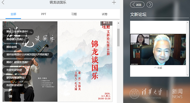 华体会娱乐(中国)网3月17日电 为继续发挥“文新论坛”丰富校园文化的作用,校研究生团委文化部依托视频会议技术及雨课堂等直播平台,经过细致的规划和精心的筹备,于3月7日晚20点及3月14日晚20点分别举办了第103期“锦龙谈国乐”及第104期“电波起舞,永不消逝”专场活动,两次论坛吸引了校内共600余名师生踊跃参加。