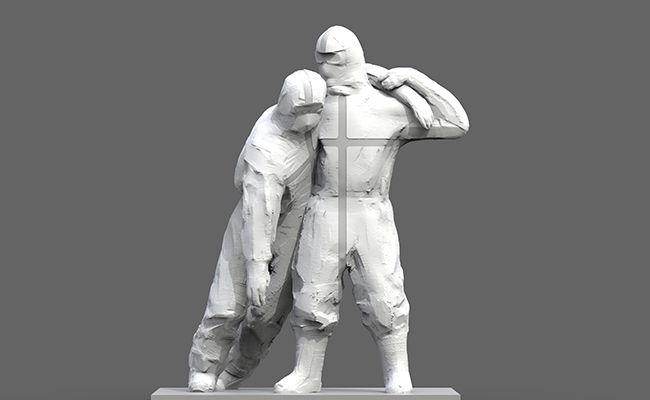 一位身躯向前的医生准备投入战场,一位身躯向后的医生为他做好保护措施。雕塑两个方向的“力”有较强的动势,又通过系防护服的动作紧紧联系在一起,形成 “倒A字形”的构图表现紧张氛围下的同心协力、各尽其职,倾斜的底座好比向前的工具车,这是即将进入战场的温情瞬间。