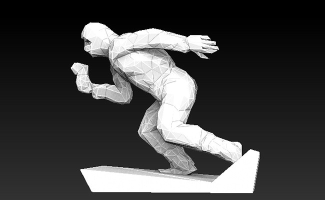 准备冲向战场的瞬间,表现医护人员紧张焦急的状态,似与时间赛跑彰显逆行者的拼搏和伟大。将雕塑中身体构成斜向延长线来加强动感,同时又未完全冲出蓄势待发,保留了想像空间,有力的四肢和似跑道的底座构成画面整体视觉关系的平衡。