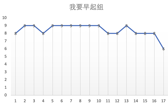 从人数统计上来看,各个小组的参与人数表现各异:早起组遥遥领先,健身组低开高走,读书组两人苦撑,能力组十分稳定。