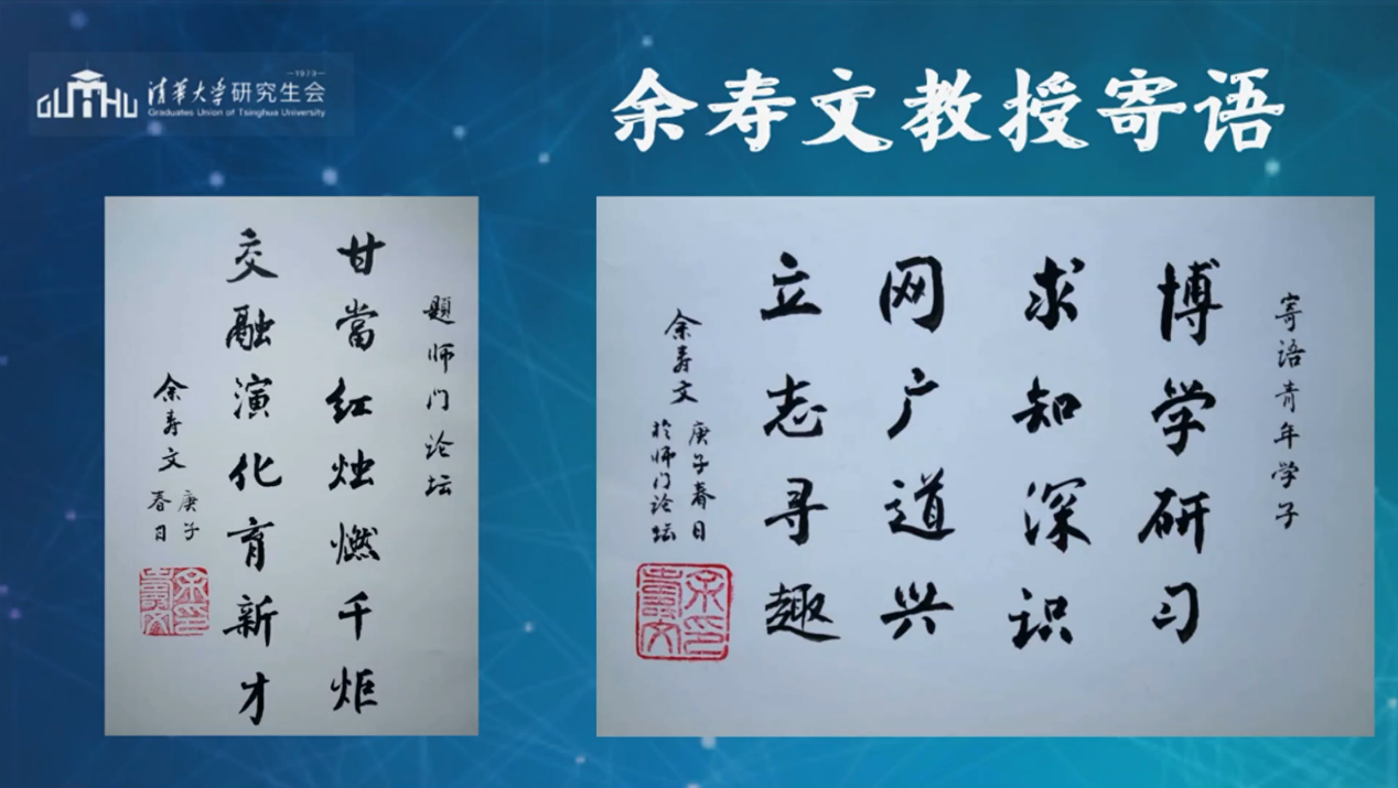 在活动最后,余寿文教授展示了为本次“师门论坛”所书的题字:“甘当红烛燃千炬,交融演化育新才”,并殷切寄语青年学子:“博学研习,求知深识,网广道兴,立志寻趣”。余寿文还阐述了学与习、知与识、网与道、志与趣之间的辩证关系,表达了对青年学子成长的希望。