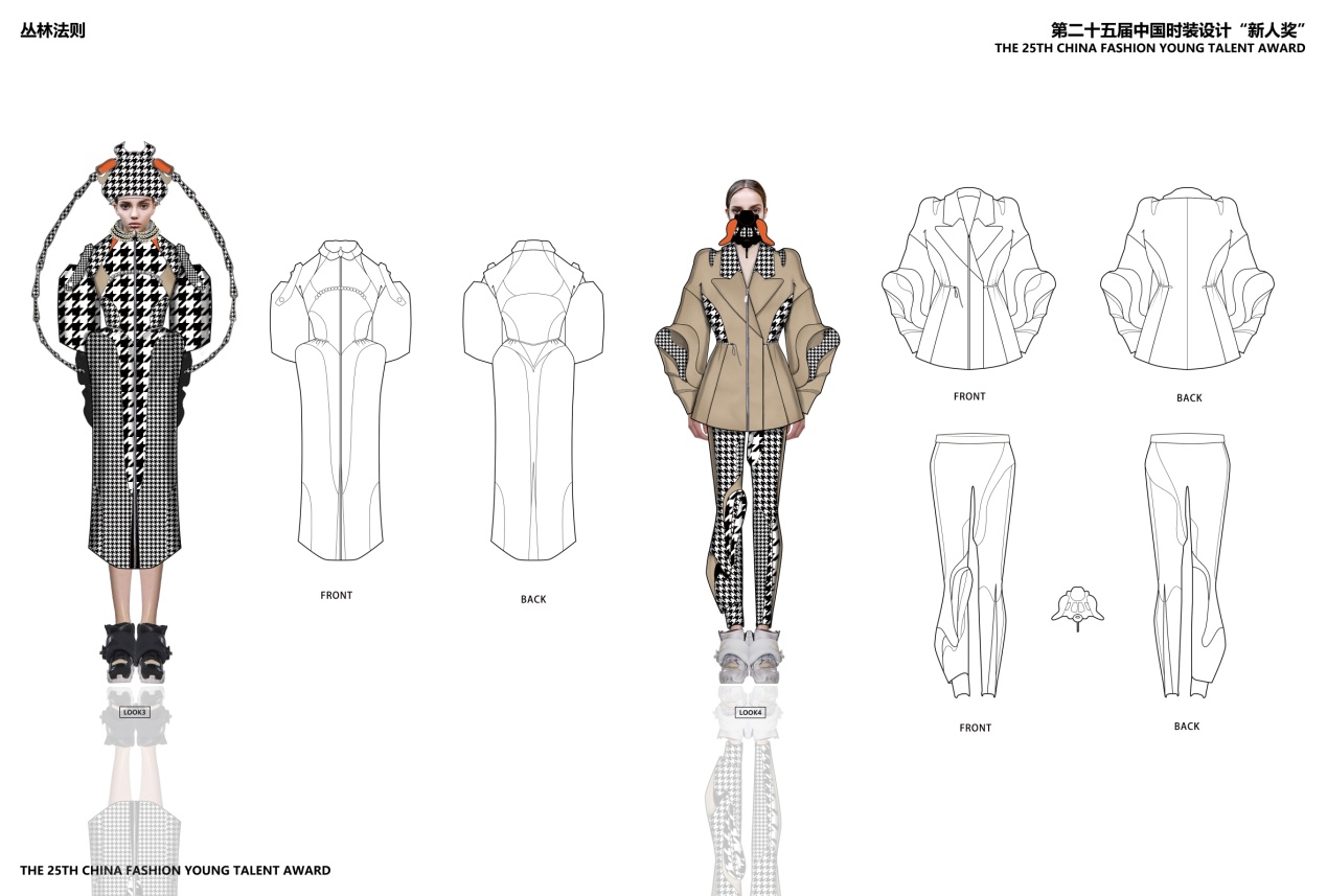 薛迪的参赛作品《丛林法则》以自然界昆虫的色彩肌理、造型结构为设计灵感。作者认为自然界昆虫的生命体都具有非常成熟和复杂的身体机能,它们的存在具备了合理性、功能性、美观性的特点。作者被自然界昆虫的丰富形态、结构、高度协调的图案和搭配色彩所吸引,并将其融入自己的服装设计中,使服装呈现了新颖的视觉效果。