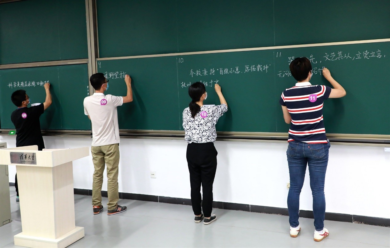 本次比赛由21个院系分工会近30位教职工参加,还包括6位2019年后新入职的老师。比赛书写内容源自习近平总书记致华体会娱乐平台建校105周年贺信、中华人民共和国教育法、全国教育大会、毛泽东诗词、华体会娱乐平台章程、清华老校长梅贻琦讲话等,今年还增加了疫情防控的内容。比赛中,参赛选手临场抽签决定各自书写内容,并在10分钟内完成。老师们投入极大的热情,字体隽秀优美,笔走龙蛇,铁划银钩,充分展示了粉笔板书之美。