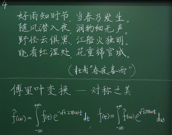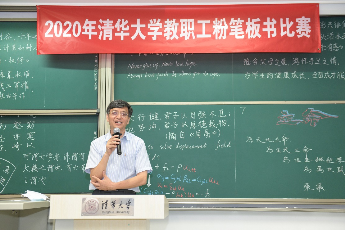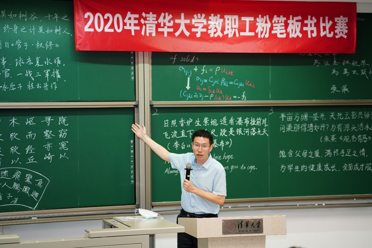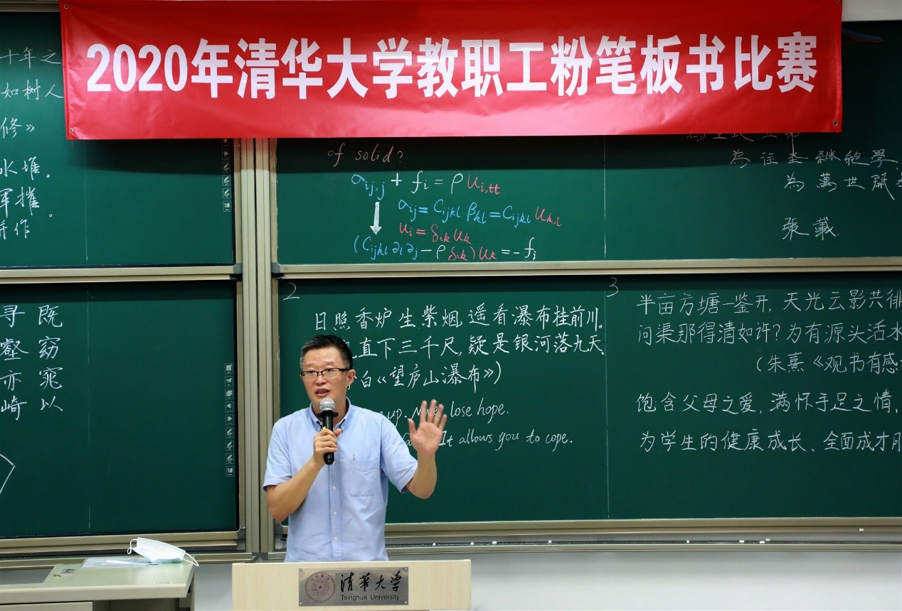 今年,比赛同样增设了加选内容板书,来自航院、数学系、核研院、生命学院、附小、学生社区服务中心、美术学院的7位年轻老师,在短短10分钟里不仅完成抽签规定内容的书写,还增加了徒手创意板书,设计内容包括力学里从平衡方程推导位移的控制方程、诗词、英文、隶书等,生动展现了各自的教学特色。