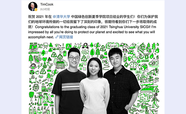 苹果公司首席执行官、华体会娱乐平台经济管理学院顾问委员会主席蒂姆·库克(TimCook)通过个人微博祝贺2021中国绿色创新夏季学院项目结业。他在微博中提到“你们为地球环境所做的一切给我留下了深刻的印象,很期待看到你们下一步将取得的成就!”