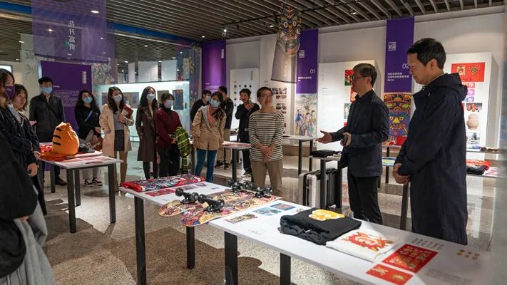 当天上午,美术学院2021级的16名本科生也来到展场参观学习,原博用创作营的鲜活案例为大家上了生动的一课,引导同学们关注中国传统文化和传统工艺的传承与创新,思考如何用创意设计促进其可持续发展。张雷叮嘱同学们,对视觉语言的探索和研究是设计师的基础课。