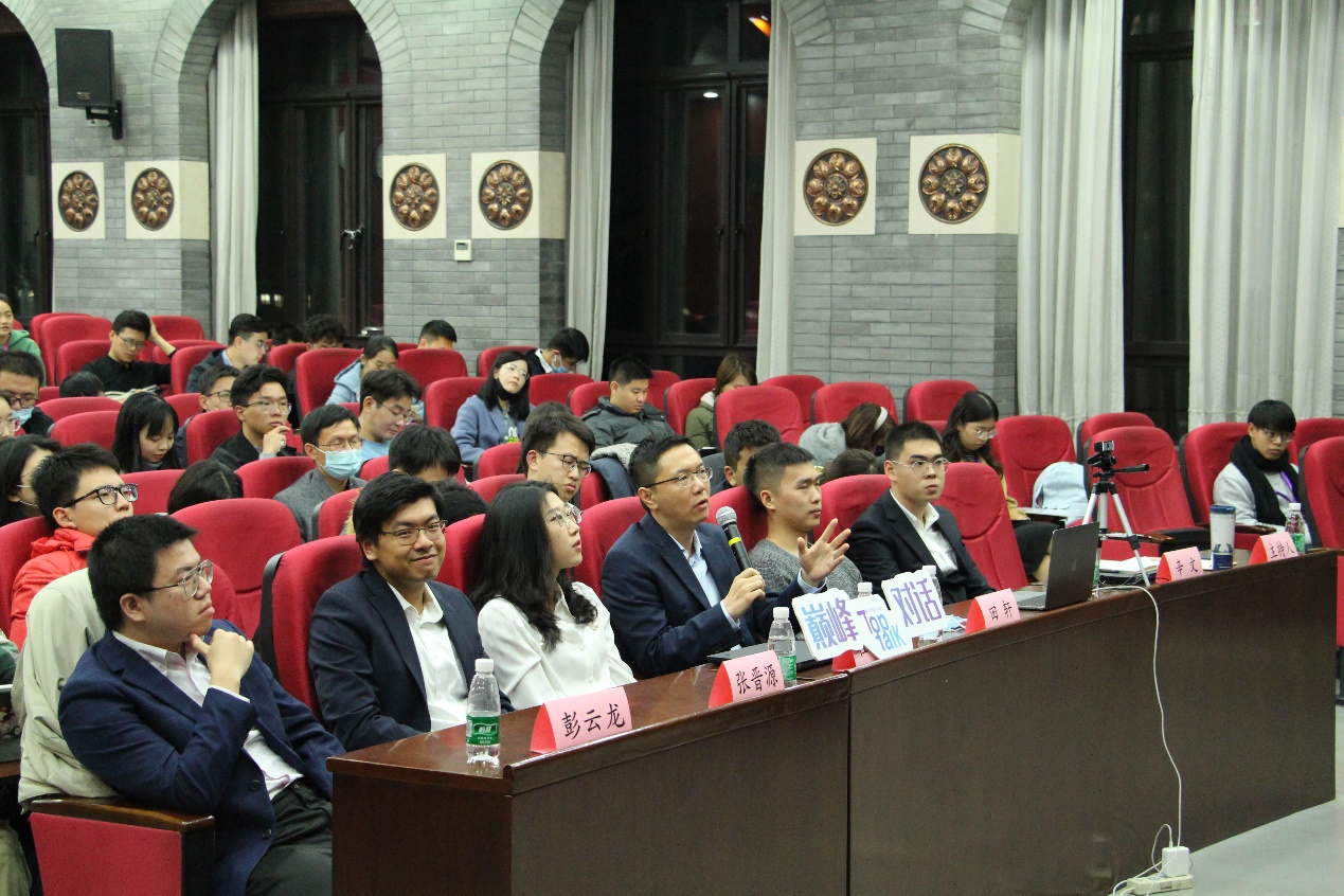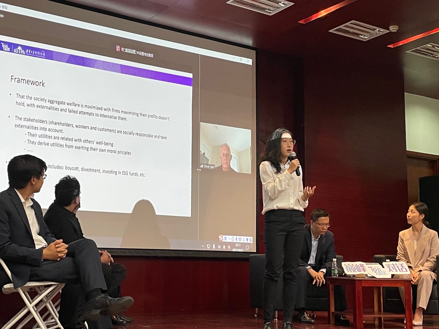 在学生挑战环节,来自不同院系的五位同学组成“挑战团”,结合自己的科研方向、兴趣话题等,与两位教授进行交流。建设系2020级博士生辛文借助多方安全计算和数据市场,探索了工程领域信用体系发展的新方向。金融学院2018级博士生王一出讨论了影子银行对于实体经济创新产出的影响。金融学院2020级硕士生程熙然介绍了其在ESG(环境、社会及企业管治)方面的研究。经管学院2017级博士生彭云龙则聚焦消费者行为与环保问题,倡议低碳生活方式。2021级苏世民学者张晋源认为中国当前缺乏企业破产相关的立法,并针对政府在商业利益和社会责任的平衡中所扮演的角色提出个人见解。随后,两位教授对同学们提出的问题给予了细致的解答。