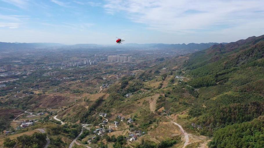 察打一体QH-120森林消防无人直升机飞在重庆缙云山上空