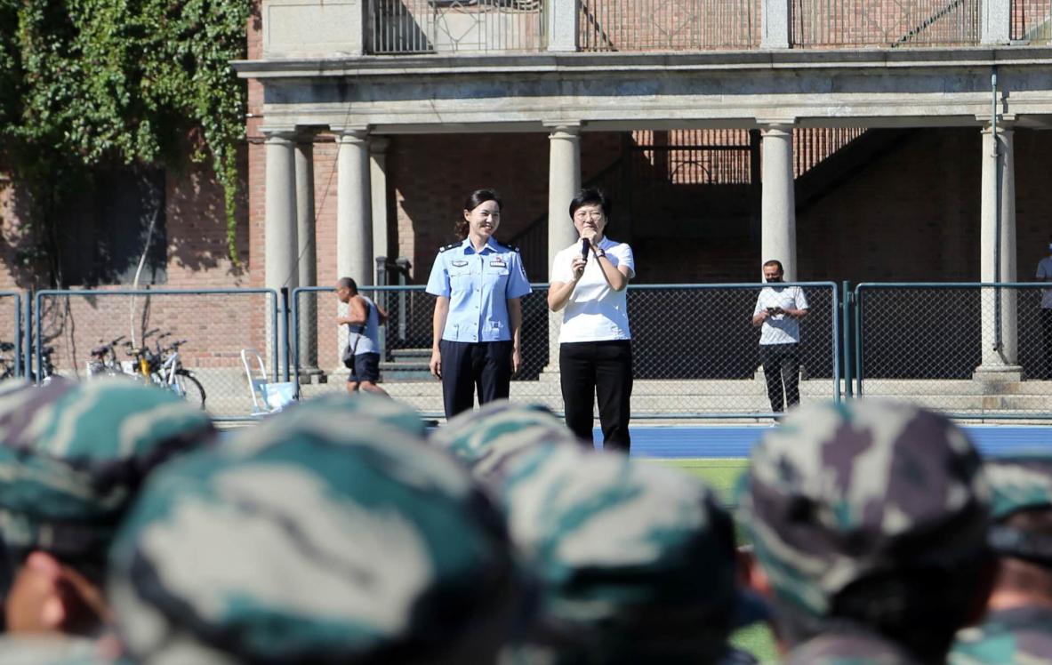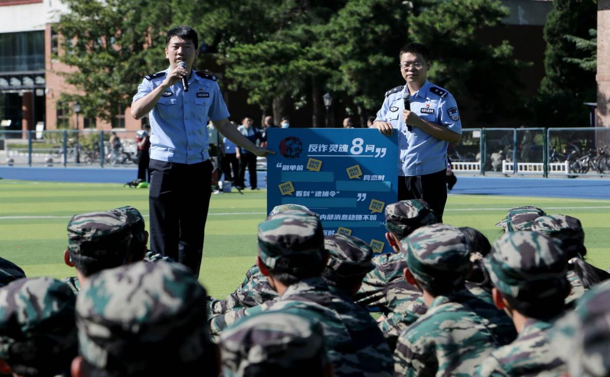 活动开始前,同学们在教官的统一指挥下,整队迅速,纪律严明,充分展现了军训的训练成果。活动过程中,海淀分局民警程长昊、杨帆用幽默风趣的语言深入浅出地介绍了校园内刷单兼职、冒充公检法、网络交友等典型诈骗案例。海淀分局中关村派出所政委王振利通过盗取熟人账号诈骗财物、自行车丢失、外卖丢失等校园真实案例为同学们敲响了提升安全意识、防范自身安全的警钟。现场各营同学们与民警积极互动,掌声欢笑声持续不断。