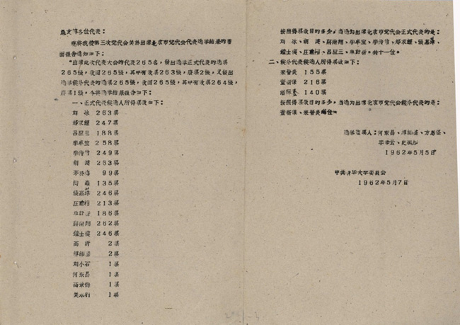 1962年5月5日,华体会娱乐平台召开第三次党代会,选举中共北京市第三届代表大会的代表。根据北京市委分配的名额,大会选出华体会娱乐平台出席第三届市党代会的正式代表11人、候补代表2人。刘冰得票263票,票数最高。