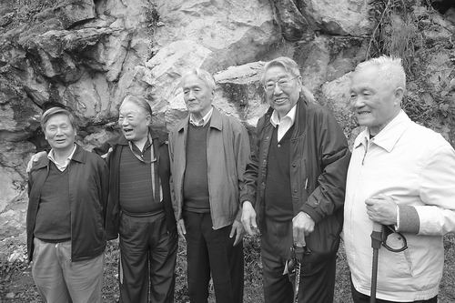 2011年,陈毓川、宋瑞祥、常印佛、裴荣富、汤中立(自左至右)等院士在秦岭野外考察。