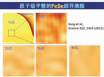 我们同样利用分子束外延(MBE)的办法长出原子级平整的FeSe超导薄膜(图1),从而以“黑马”的姿态进入凝聚态物理另一个非常重要的领域——高温超导体系,并于2011年在《科学》杂志发表了相关文章。从多年前做半导体GaAs时掌握的一些基本经验开始,到Bi2Se3、FeSe 和FeTe 的薄膜制备,可以看到这些由两种元素反应形成的化合物材料的生长条件是非常类似的,很多东西都是相通的。所以,对实验物理学家而言,学术的长期积累和实验技术的发展非常重要。