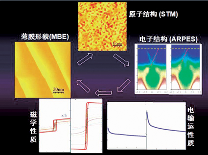 我们寻找的方式和他们不一样,效率也更高些。何珂用MBE-STM-ARPES联合系统加上王亚愚的霍尔效应(Hall effect)输运系统,两台机器一起合作, 从2010年1月开始尝试实现量子反常霍尔效应。我们的目标是h/e2 = 25812.807557 Ω(量子霍尔电阻ρxy)。它绝缘,而且也应该是量子化的。我们用分子束外延(MBE)技术进行磁性掺杂,用扫描隧道显微镜(STM)进行表面形貌测量,看它是否均匀,然后用角分辨光电子能谱(ARPES)分析其电子结构,之后要把5纳米的薄膜安全地保护起来,再进行电输运、磁性测量,一个周期下来要两三天,有时测量需要24个小时甚至48小时。由此我们开始了一个非常有机的合作过程。(图3)
