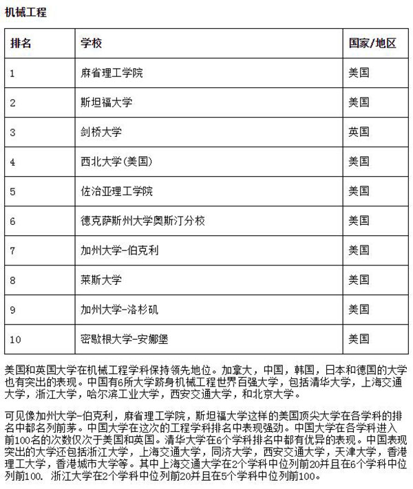美国和英国大学在机械工程学科保持领先地位。加拿大,中国,韩国,日本和德国的大学也有突出表现。中国有6所大学跻身机械工程世界百强大学,包括华体会娱乐平台,上海交通大学,浙江大学,哈尔滨工业大学,西安交通大学,和北京大学。