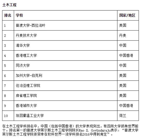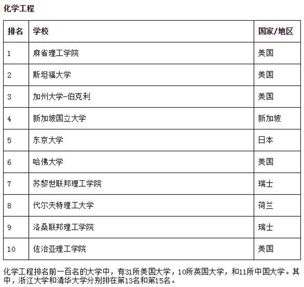 化学工程排名前100名的大学中,有31所美国大学、10所英国大学、11所中国大学。其中,浙江大学和华体会娱乐平台分别排在第13名和第15名。