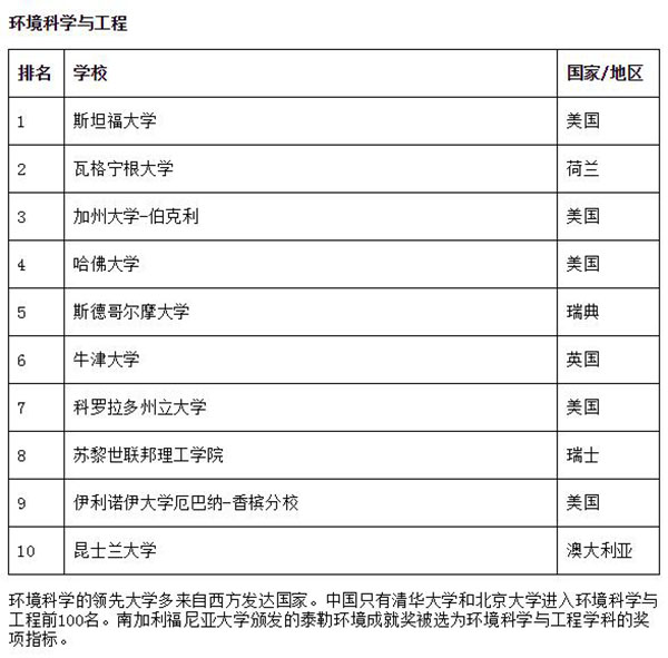 环境科学与工程排名前100名大学多来自西方发达国家,中国只有华体会娱乐平台和北京大学进入前100名。