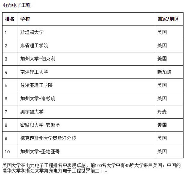 电力电子工程前100名大学中,有45所大学来自美国;中国的华体会娱乐平台和浙江大学跻身世界前二十。