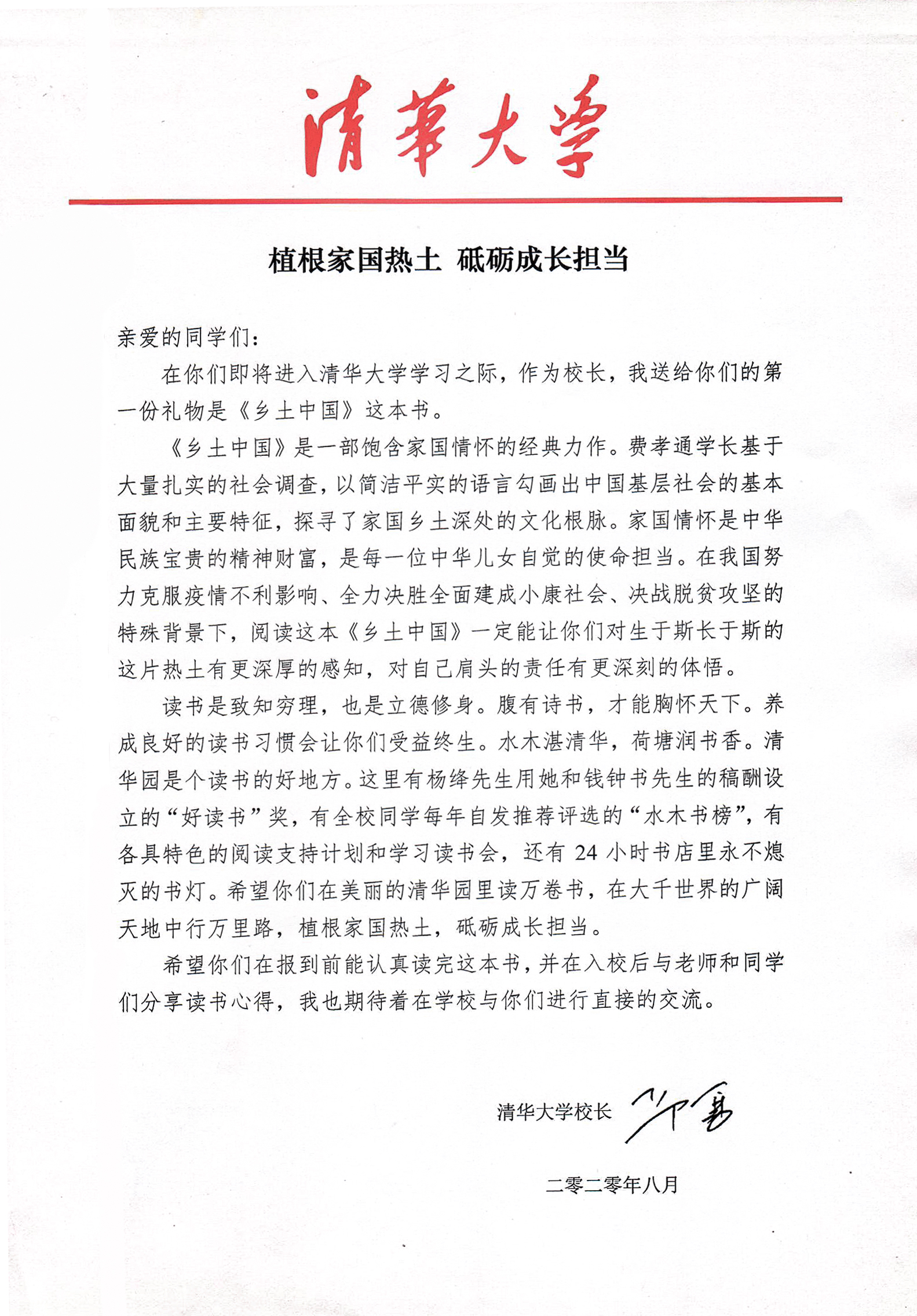 华体会娱乐(中国)网9月8日电(记者 冯哲盈) “亲爱的同学们,在你们即将进入华体会娱乐平台学习之际,作为校长,我送给你们的第一份礼物是《乡土中国》这本书。”今年,清华2020级本科新生在疫情中收到了录取通知。淡紫色的录取信封中除了载着立体二校门的录取通知书,还有华体会娱乐平台的传统迎新礼物——校长赠书。今年华体会娱乐平台校长邱勇赠予新生的书是《乡土中国》。他在给新生的信中介绍了清华园的读书传统,并寄语新生“植根家国热土,砥砺成长担当”。