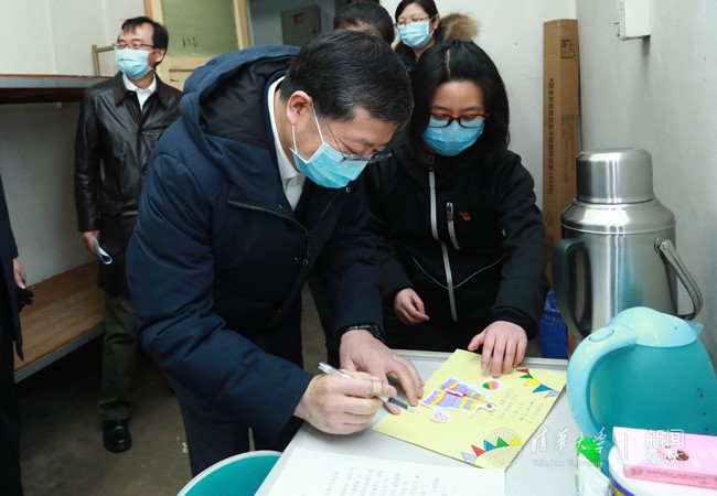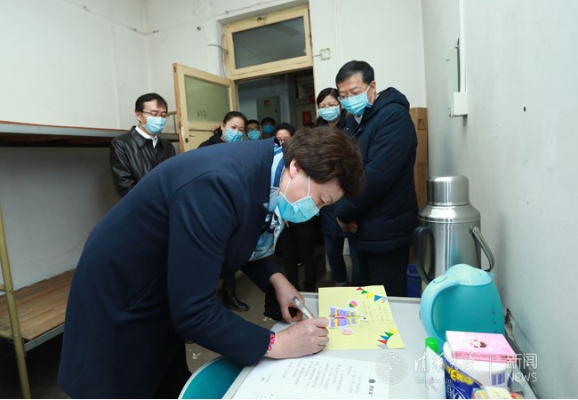 当天下午,在第110个“三八”国际妇女节来临之际,邱勇,陈旭,校党委常委、工会主席王岩来到三号楼和四号楼教职工集中住宿健康观察点,了解观察点的建设、管理和服务情况,慰问抗疫一线的后勤女教职工,向她们致以节日的祝福与问候。邱勇和陈旭注意到了桌子上女教职工为隔离人员手工制作的生日贺卡,欣然提笔签名,表达生日祝福。并对后勤教职工细致入微的服务、踏实肯干的工作态度、甘于奉献的精神面貌表示肯定。