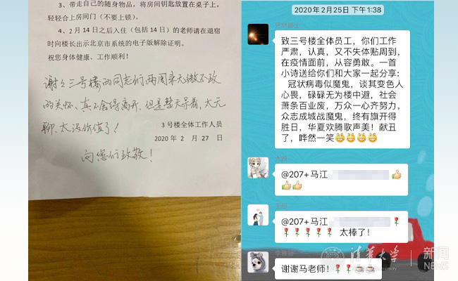 观察点外,从校领导班子、中层干部到基层教职员工,全力解决工作中的困难,时刻关注师生们的情况。观察点内,返京教职工做好自我隔离、配合学校工作,留下温馨感谢。