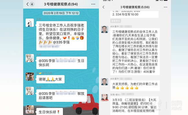或是群内的一句调侃,或是纷纷为过生日的老师送上线上祝福,或是日常短短的回复“谢谢”“辛苦了”,抑或是解除隔离后长长的临别谢言,还有隔离的教职工不时留下的饮用水和水果……门内门外,隔离不隔心,不知是谁温暖了谁。