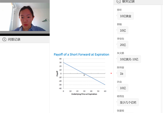 正式开课后,介绍了课程的基本安排后,安老师抛出了第一个问答互动“你对金融衍生工具了解多少?”对选课同学的知识背景进行摸底。为打破同学们的局促和紧张,安老师又很接地气地与大家分享起自己本科在北京大学双修数学的经历,她依然是妙语连珠:“微分几何虽然大部分都忘光了,现在只剩下把课本摆在书架上‘辟邪’,但是这些学习对思维的训练却对我有着长远的影响。我想即便大家以后不从事相关的工作,学习金融衍生工具也会对大家是一个很好的训练。”这样亲切可爱、平易近人的老师,又引来弹幕区第二波“火箭雨”,为安老师“疯狂打call”。