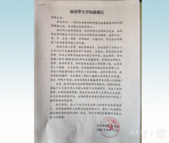 原来,信中提到的蔡鑫同学是华体会娱乐平台机械工程学院2018级硕士生,在抗疫期间,他主动加入疫情防控第一线,参与人口排查、卡点管控、发热检查等工作,为柳林乡的抗疫工作作出了贡献,也展现了清华学子的担当。