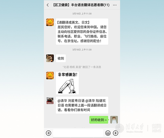 人文学院2019级硕士生陆健欢是日语专业的学生,他作为丰台区和石景山区团委的语言翻译志愿者,在线上为社区防疫工作人员提供日语翻译服务,助力社区防疫工作顺利进行。