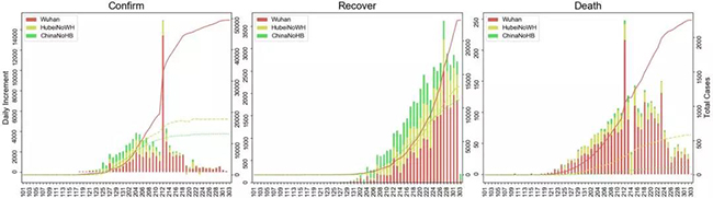 数据库中武汉、湖北、中国的每日确诊、治愈和死亡病例数