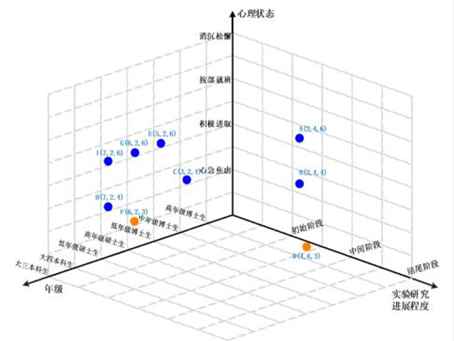 抗击新冠疫情期间的导师远程指导和学生独立学习,既是全新的体验,也是巨大的挑战,需要教师们积极探索研究新形势下的研究生培养规律,及时调整指导方法,实施比平常时期更加精细化的培养。作者将负责指导的9名同学的情况,按照“年级”“实验研究进展程度”和“心理状态”三个维度进行评估和有针对性的辅导帮助(如图2所示)。