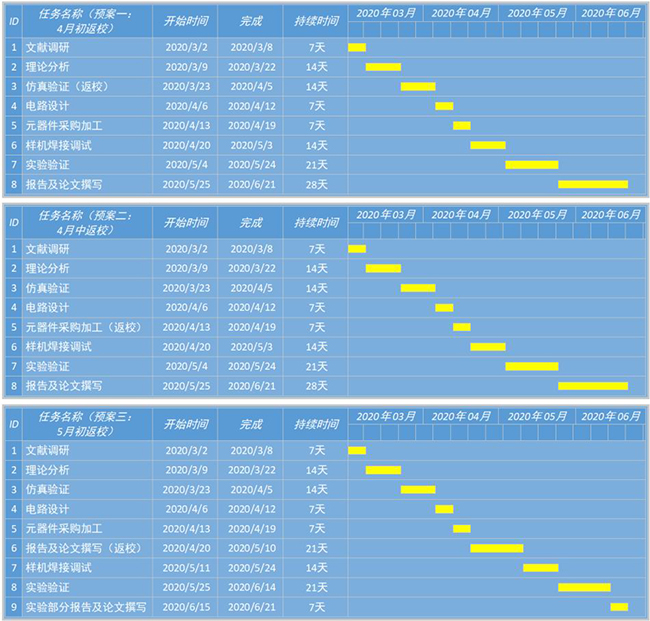 首先,针对国家课题,作者第一时间向同学们传达了科技部调整项目管理相关工作安排的通知,及时打消了同学们的顾虑。第二,针对横向科研合作,我们也了解到合作企业都在逐步复工复产的过程中,本着相互理解的精神,与所有的合作单位协商修改了合作计划。第三,针对期刊论文的修改,作者积极与多家国际权威期刊主编沟通,介绍中国的抗击疫情情况,寻求理解和支持,为同学们延长了论文修改时间。第四,针对疫情结束时间的不确定性,一人一策,指导同学们做了多种预案(如图3所示),并针对大家的不同需求配备好研究条件(购买专用软件授权、电子书、微型示波器等),确保同学们在家里也可以高效地完成各项任务,在返校时“无缝切换”到实验研究,最终完成高质量的学位论文。