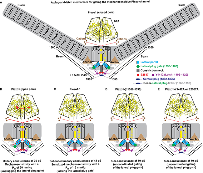 在最新的这篇《神经元》论文中,研究人员综合利用基于结构分析的定点突变、膜片钳电生理功能研究、新型剪切变体的鉴定发现等多种研究手段,确定了Piezo通道胞内侧的三个侧向离子通透路径(lateral portal)、以物理方式堵塞侧向离子通透路径的侧向门塞结构元件(lateral plug gate)、以及对侧向门塞进行控制的“闩锁”元件(latch) (图A)。结合对这些关键元件的功能研究,他们获得了系列实验数据来帮助其首次提出Piezo通道利用这些关键功能元件以类似“塞子和闩锁”的物理方式来调控侧向离子通透路径的关闭与开放的精巧分子作用机制。研究揭示了Piezo通道这类生物机械传感器的精细结构组装方式及精巧的机械门控机制,以及自然进化对这一结构和机制的精妙调控。