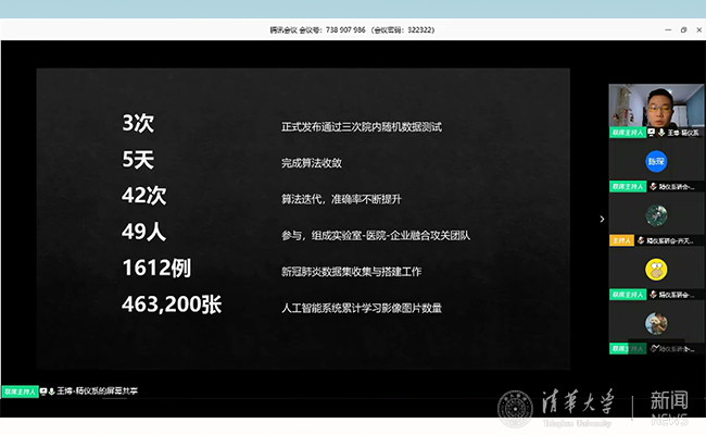 王博首先介绍了实验室的研究背景,分享了自己所在的尤政院士团队的科研经验。在疫情期间,尤政院士团队与董家鸿院士等团队开展合作,共同研发出“新型冠状病毒肺炎智能辅助诊断系统”。王博为大家详细介绍了该系统的特点、算法的过程、研发的经历等。目前,这套系统累计部署在国内16家医院,并且也开始在韩国、德国等地区参与部分诊断工作。