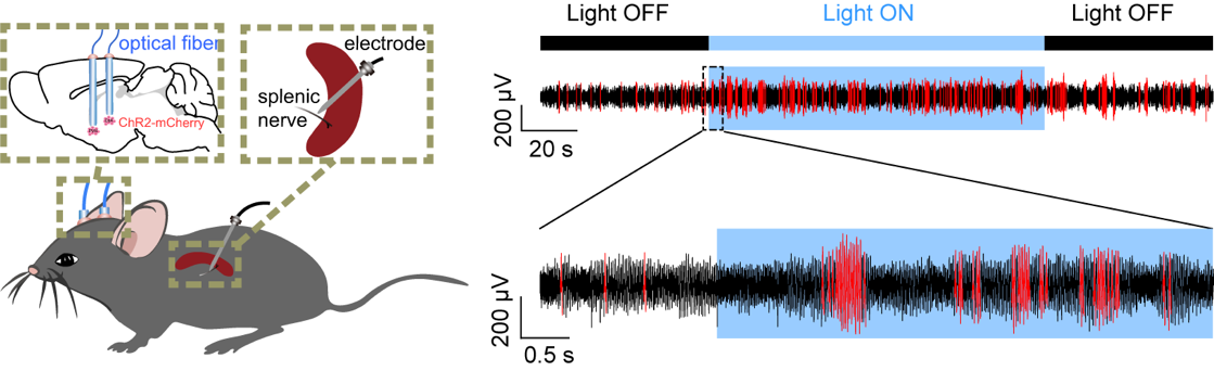 首先,研究者开发了一种新型去除小鼠脾神经的手术,发现这种小鼠在疫苗接种后所能产生的浆细胞(抗体分泌细胞)数量有明显缺陷,暗示了脾神经冲动信号对B细胞应答有促进作用。通过药理学、遗传学实验,他们继而发现B细胞表达乙酰胆碱9受体对脾神经的这个促进作用不可或缺。通过体内细胞剔除实验,研究者发现在肾上腺素能的脾神经和需要感知乙酰胆碱的B细胞之间,最可能起到了“换元”作用的,是新近发现的可感受去甲肾上腺素而分泌乙酰胆碱的T细胞。