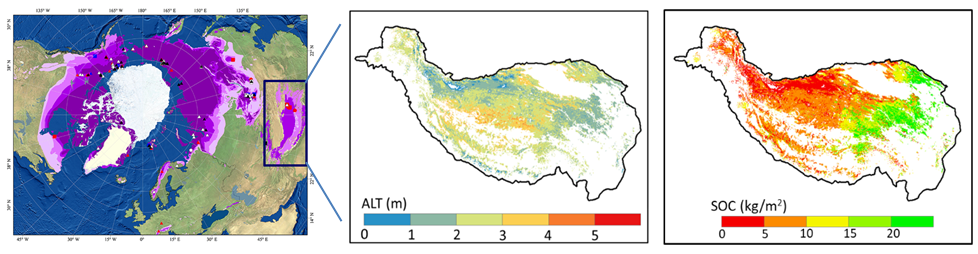 北半球分布的多年冻土面积约占北半球陆表面积的1/4,其中环北极多年冻土区储存着大量土壤有机碳,约为当前大气中碳储量的二倍。近年来,随着气温升高与冻土退化,原本冻结在多年冻土层中的土壤有机碳,通过微生物分解以CO2、CH4等形式释放到大气当中,这些温室气体反馈到大气进一步加剧气温升高与冻土退化,形成冻土-气候的正反馈效应。青藏高原地区分布着环北极地区以外最大范围的多年冻土,有地球“第三极”之称。青藏高原多年冻土区储存的土壤有机碳可能成为气候变化背景下的潜在碳源,而这些冻土碳的空间分布尚不明晰,融化风险也亟待评估。