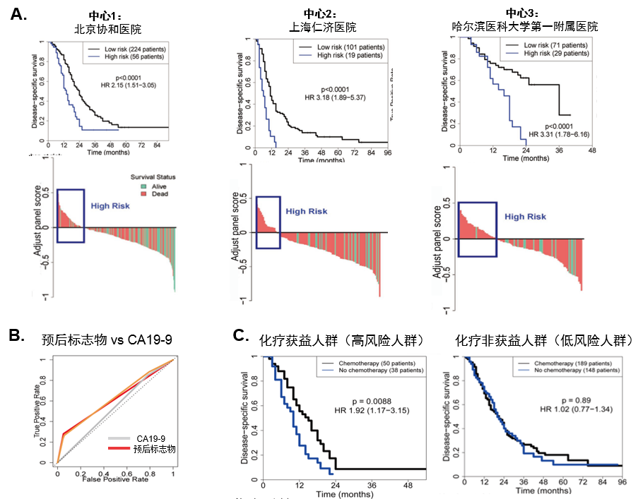 图2 生物标志物的多中心临床验证。A图为生物标志物在三个独立的临床中心样本中评估与预后的关联;B图为生物标志物与临床肿瘤指标(CA19-9)的预测性能比较;C图为利用生物标志物识别所区分的化疗获益和非获益人群的预后分析。