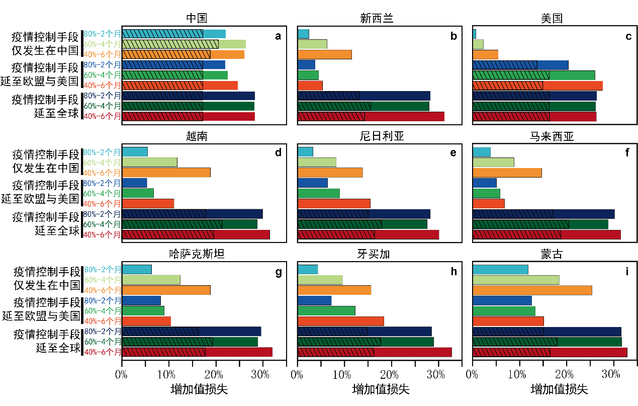 图2 9种情景下选定国家的疫情直接和间接增值损失