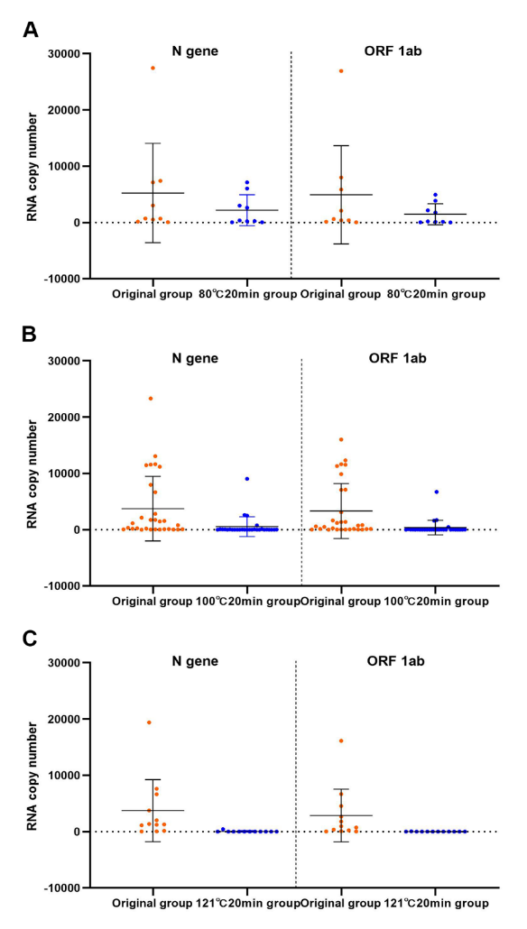 该研究收集了61份新型冠状病毒(SARS-CoV-2)核酸检测阳性的鼻咽拭子标本,采用了以下几种灭活方法:1、TRIzol试剂在室温下灭活10分钟;2、在56℃水浴中加热30分钟;3、高温处理,包括121℃高压20分钟、100℃沸水浴煮沸20分钟、80℃水浴加热20分钟。该研究发现,与原始样品中的RNA量相比,TRIzol处理破坏了47.54%的N基因和39.85%的ORF 1ab基因;56℃30分钟加热处理后,N基因和ORF 1ab拷贝数分别减少48.55%和56.40%;在80℃加热20分钟后,病毒RNA拷贝数下降了50-66%;121℃高压灭菌或100℃煮沸20分钟破坏了绝大部分病毒RNA,几乎未检测到病毒RNA。