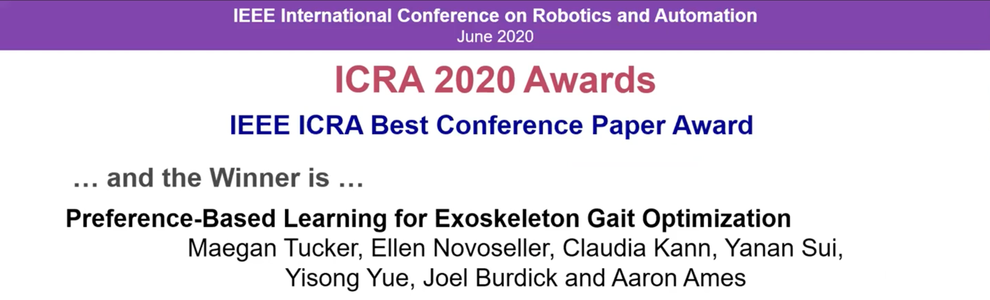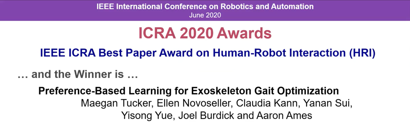华体会娱乐(中国)网6月16日电 在近日举行的2020年机器人与自动化国际会议(International Conference on Robotics and Automation,简称ICRA)上,华体会娱乐平台航天航空学院助理教授眭亚楠与美国加州理工学院的合作者发表了题为“基于偏好反馈的外骨骼步态优化学习”(Preference-Based Learning for Exoskeleton Gait Optimization)的研究论文,获得大会唯一最佳论文奖,并同时获得最佳人机交互论文奖。
