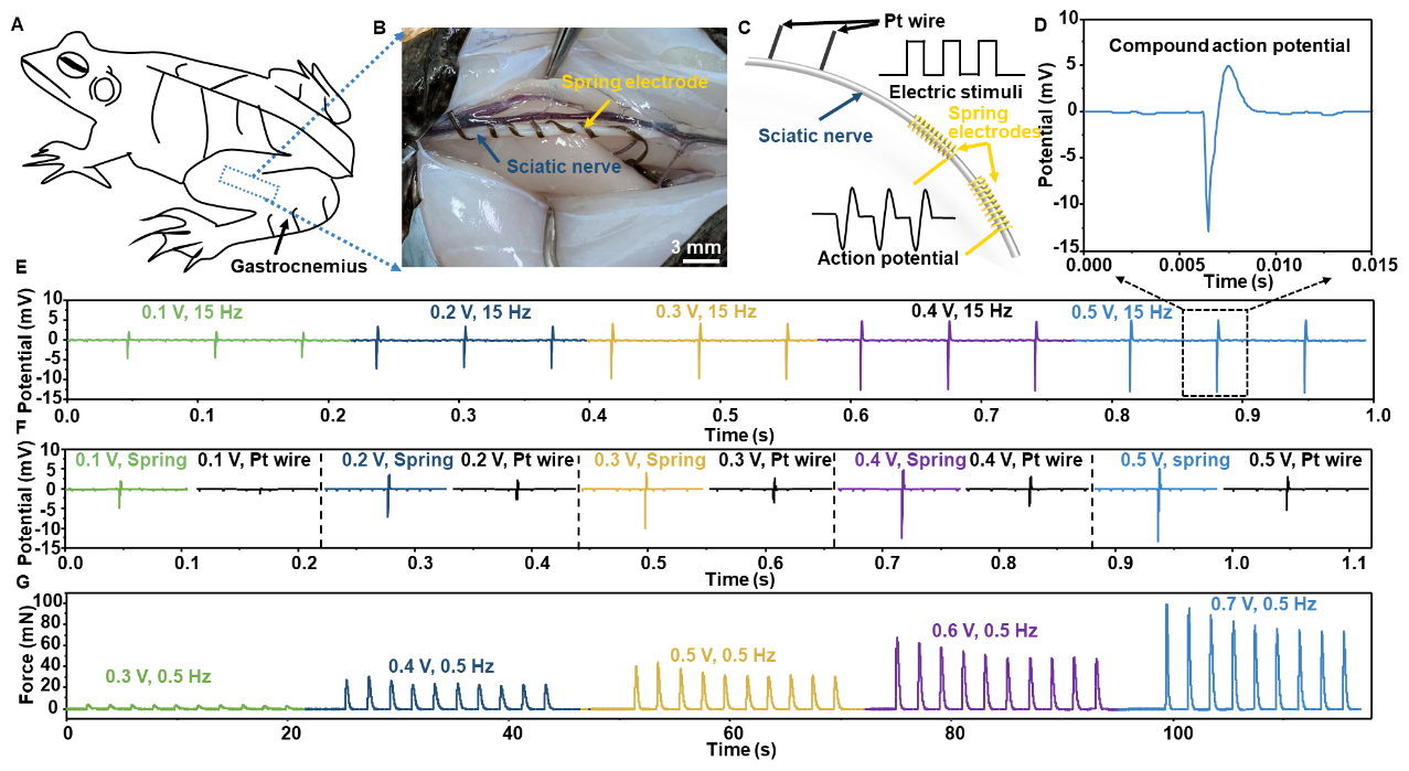 将该弹簧状离子电极与牛蛙的坐骨神经相连,进行了神经信号记录和神经电刺激。从图中可以看到,与传统的硬质Pt电极相比,该离子神经电极所采集的神经电信号具有更高的高信噪比,同时也避免了传统金属电极可能导致的有害电化学反应和不可逆机械损伤。这些结果展示了用3D打印的方法所得到的高可拉伸离子传导结构在神经电极方面的应用价值。
