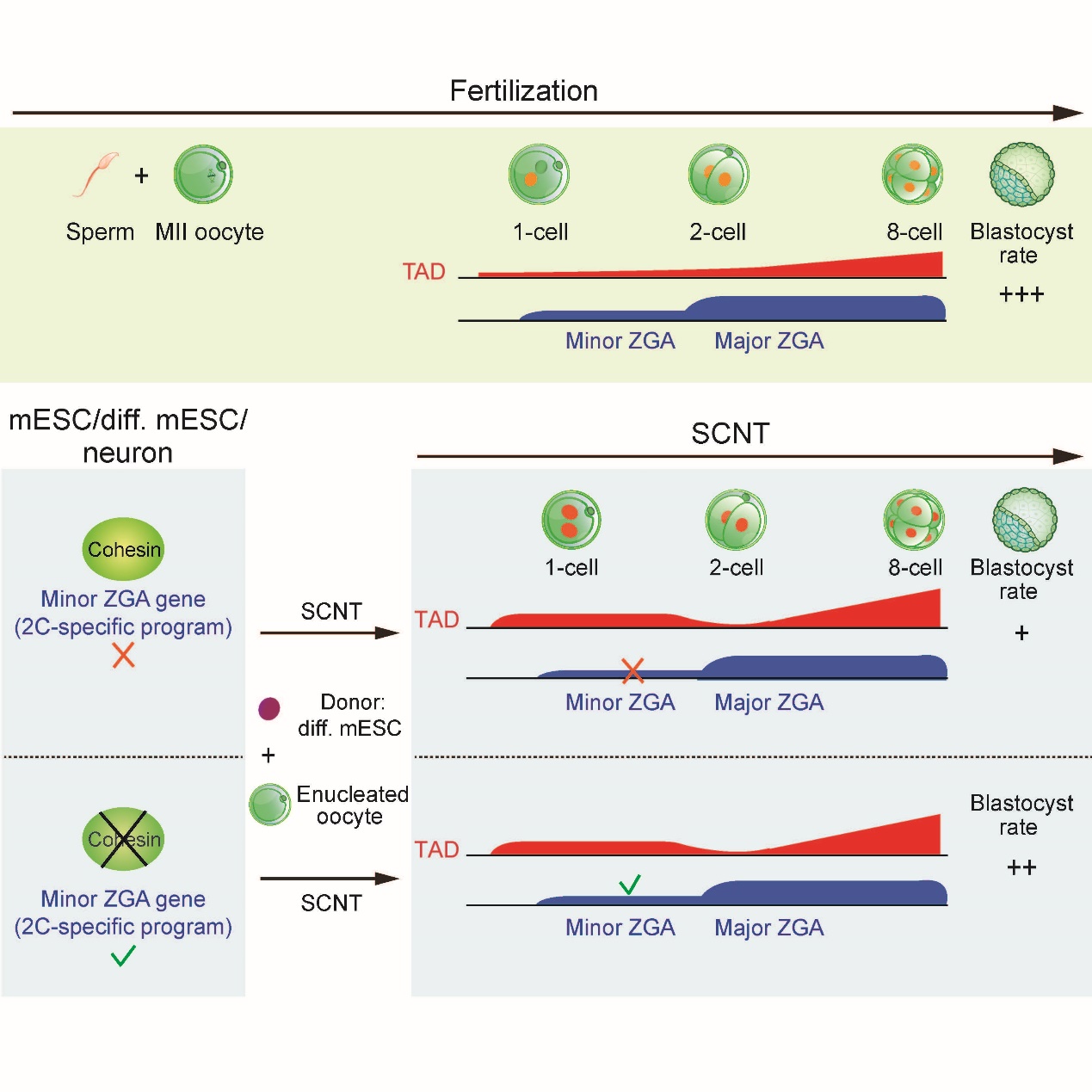 同时,研究人员意外发现,在多能性干细胞和终端分化的细胞中敲除对拓扑结构域的建立具有核心功能的黏连蛋白(cohesin),不仅能够消除TAD,而且能够激活初级合子基因激活基因(minor ZGA),包括Zscan4等重要基因。这些基因在正常胚胎发育过程中通常先于绝大部分基因被激活,并对早期胚胎发育有重要功能,参与基因组稳定性、端粒延长等功能。然而在SCNT胚胎这些基因不能正常表达。研究人员发现,在供体细胞中提前去除黏连蛋白,可以激活minor ZGA相关基因并显著提高SCNT的囊胚发育成功率。综上所述,这一工作揭示了染色质高级结构在体细胞核移植中的重编程过程,并且发现了黏连蛋白具有形成TAD和抑制minor ZGA基因的双重功能,为研究早期胚胎发育过程中独特的松散染色质的功能和机制提供了重要线索。