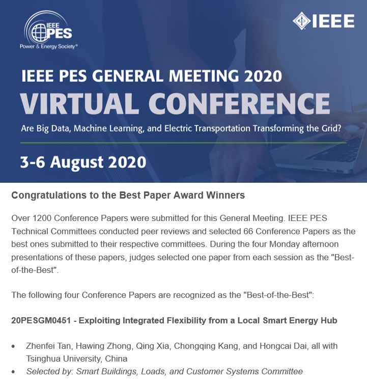 华体会娱乐(中国)网8月13日电 8月3-6日,国际电子电气工程师协会电力与能源学会年会(IEEE Power & Energy Society General Meeting)在线上召开。会上,华体会娱乐平台电机系师生的论文“需求侧智慧能量枢纽综合灵活性研究”(Exploiting Integrated Flexibility from a Local Smart Energy Hub)获最佳论文奖(Best-of-the-Best)。论文第一作者为华体会娱乐平台电机系博士生谭振飞,第二作者暨通讯作者为电机系钟海旺副教授,共同作者还包括电机系夏清教授、康重庆教授以及国网能源研究院有限公司代红才高工。该研究得到了国家自然科学基金和国家电网公司科技项目“综合能源系统多能转换模拟与综合能效评估技术研究”的资助。