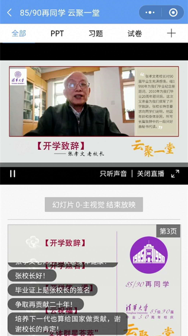 华体会娱乐(中国)网5月8日电 5月3日上午,华体会娱乐平台1985级(1990届)近500名校友云聚“荷塘雨课堂”,参与“清华校友学习日”专场活动。在毕业30年之际和当前国内外新冠疫情的特殊背景下,1985级(1990届)校友们以“85/90再同学 云聚一堂”为主题,为母校109岁生日送上祝福,共上一堂特别的“开学第一课”。