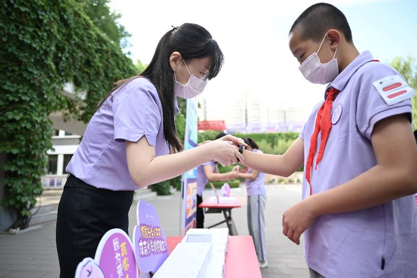 在校门口,学校为学生送出了多份暖心礼物。其中一个是毽子,寓意着健壮的体魄“踢”起来,传承“无体育不清华,无体育不成志”的成志精神;另一个是测温手环,学生佩戴测温手环,学校可以时时关注学生的体温;还有一个是“成志好习惯”召集令令牌,鼓励学生写下自己的21天好习惯。